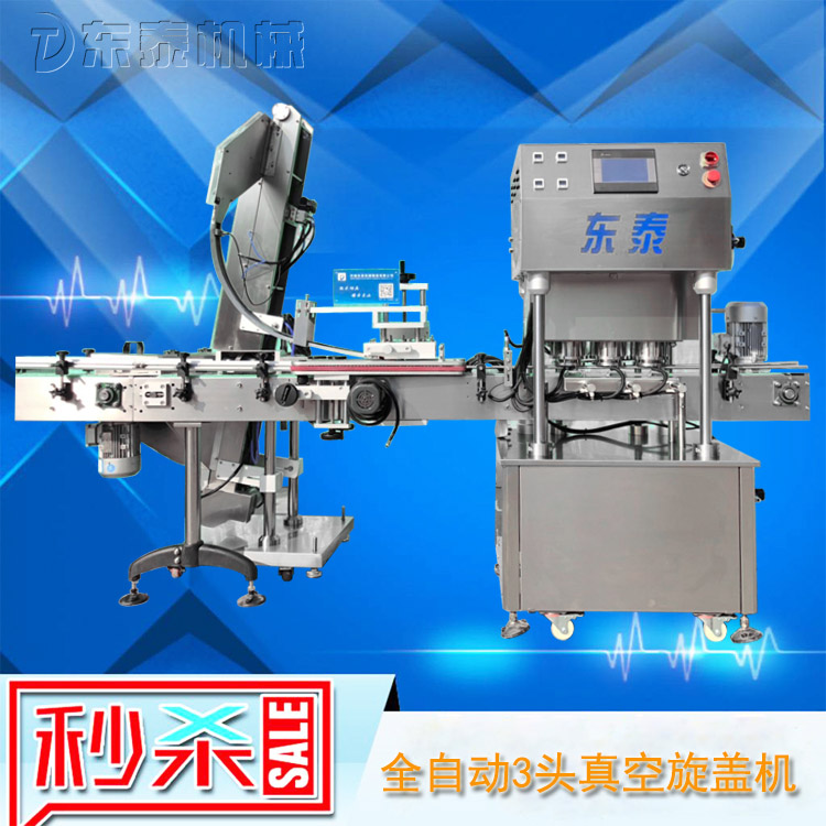 該直線式真空旋蓋機是東泰機械結(jié)合用戶使用的情況,摒棄了傳統(tǒng)轉(zhuǎn)盤式真空旋蓋機的弊端,研制開發(fā)的新型高效設(shè)備,設(shè)備自動檢測到兩個瓶子蓋子進(jìn)入到雙頭真空旋蓋機內(nèi),旋蓋機彩色顯示屏?xí)崟r顯現(xiàn)旋蓋狀況,整機多點檢測,當(dāng)進(jìn)口無瓶無蓋、出口堵塞、定位不準(zhǔn)、瓶身傾倒均自動停機。單個旋蓋頭達(dá)到的真空度都可以單顯示,單調(diào)整