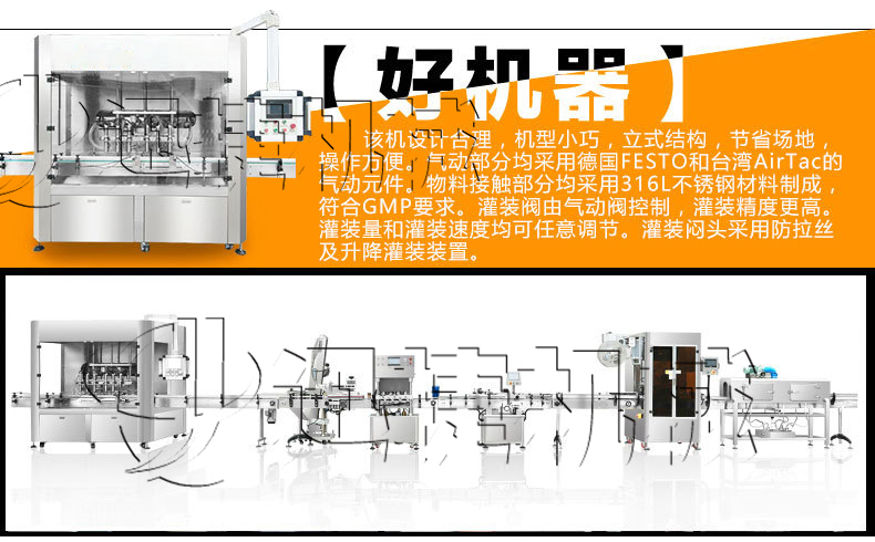 4、人機界面與PLC通訊,調試設備或更換品種只需在屏幕上設定。進瓶、定位、灌裝充填、出瓶均自動作業(yè)。