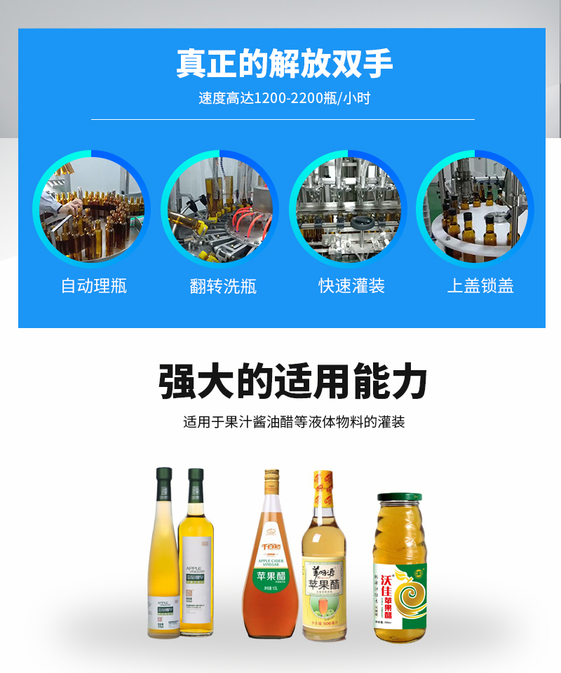 該系列果醋灌裝機(jī)采用伺服柱塞式計量灌裝原理,多項(xiàng)專利認(rèn)證,適用于各種規(guī)格(0.1-1升可兼顧到2升灌裝)的液體灌裝。