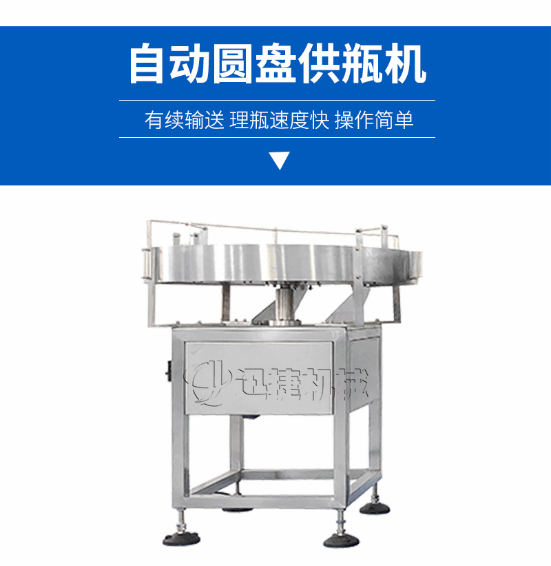 該圓盤供瓶機(jī)理瓶機(jī)是由人工將瓶子放入圓形轉(zhuǎn)盤上,轉(zhuǎn)盤轉(zhuǎn)動將瓶子有續(xù)撥入輸送帶,進(jìn)入灌裝機(jī)進(jìn)行灌裝。使用方便,噪音小,理瓶速度快,操作簡單是不可缺少的一個環(huán)節(jié)。
