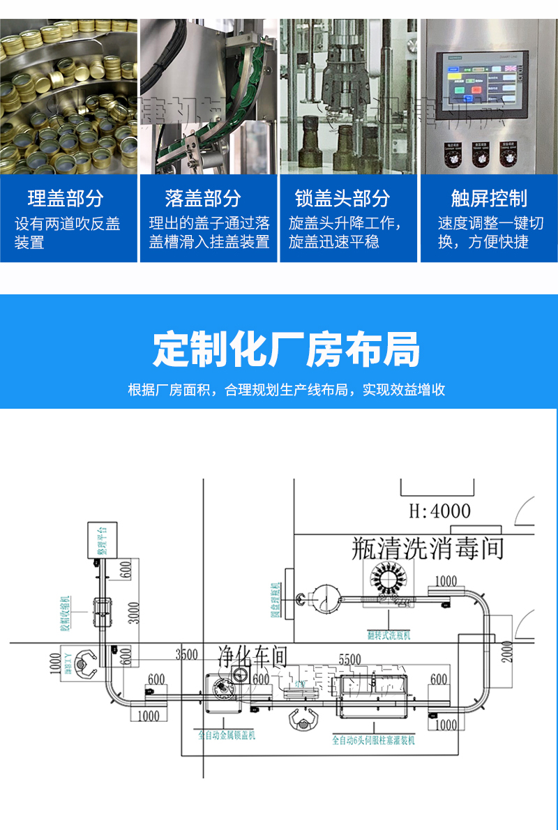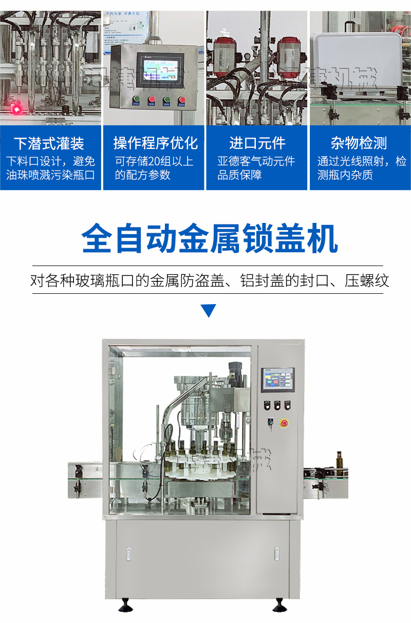 本設(shè)備適用于醫(yī)藥、農(nóng)藥、食品、化妝品、化工等行業(yè),主要針對各種玻璃瓶口的金屬防盜蓋、鋁封蓋的封口、壓螺紋等。該設(shè)備可單機(jī)使用,也可以與灌裝機(jī)等設(shè)備組成生產(chǎn)流水線自動作業(yè);