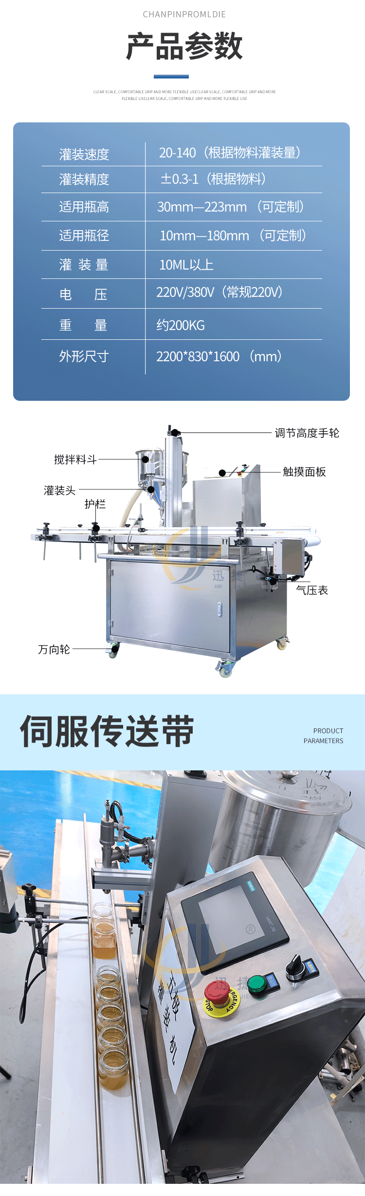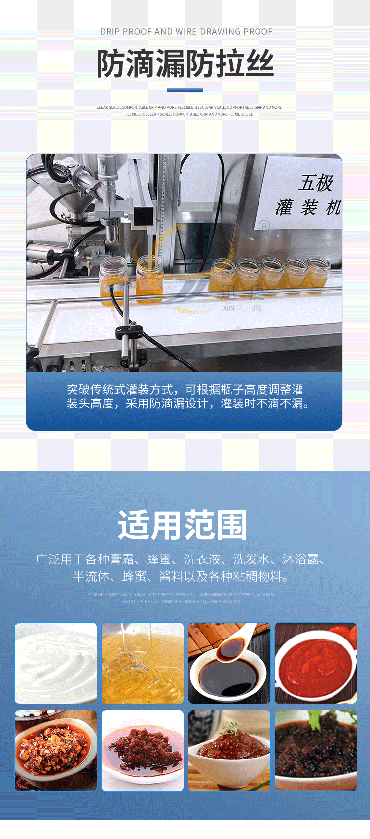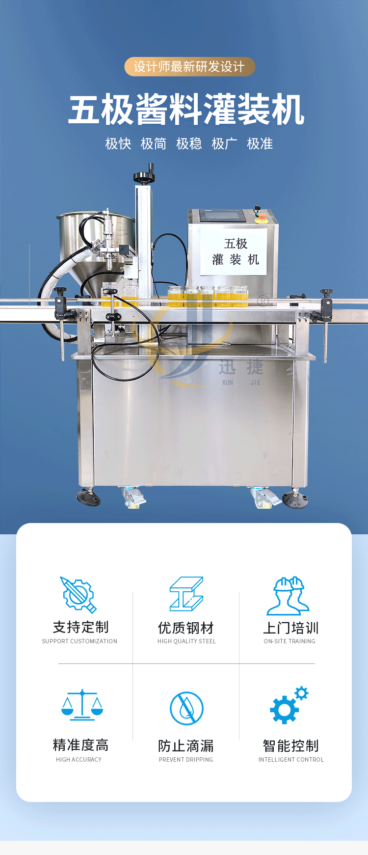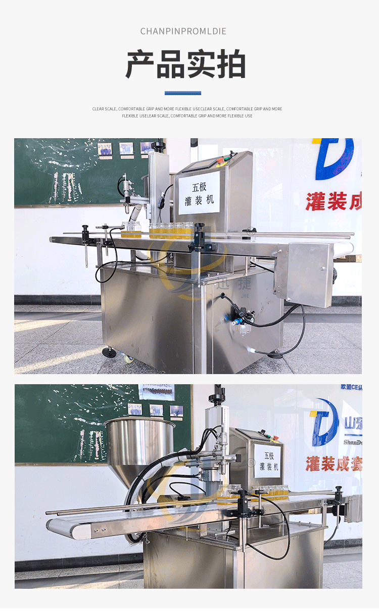 五極灌裝機(jī):極快-單頭2200瓶/時(shí) 極簡(jiǎn)-操作簡(jiǎn)單 極廣-啥啥都能灌 極穩(wěn)-24小時(shí)不停機(jī)  極準(zhǔn)-200g誤差小于1g。它可以和真空旋蓋機(jī)搭配使用。