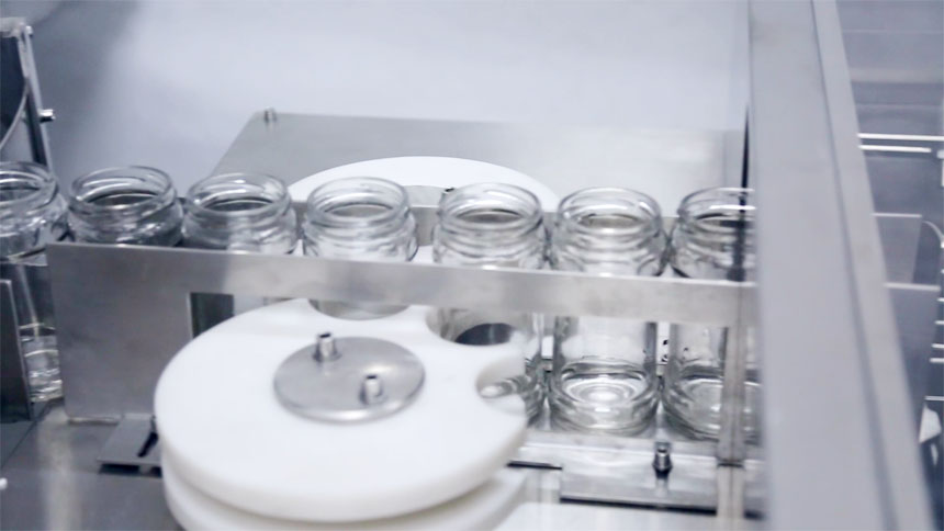 設(shè)備介紹:醬類灌裝線配套廣口玻璃瓶洗瓶機具有性能可靠、操作簡單、清洗效果良好、工作效率高等特點,主要由不銹鋼水泵、高壓噴頭、電器箱等組成。它的工作原理是先將需要清洗的瓶子裝進瓶盤內(nèi),然后人工送入工位,通過循環(huán)水噴將需要清洗的瓶子注滿水沉至清洗槽先進行簡單的粗洗。然后瓶子會上升推進洗瓶機的第二工位,在第二工位會進行三次仔細的清洗,在經(jīng)過三次氣沖、甩干,再自動進入到滅菌烘箱。清洗過程為粗洗一次,仔細清洗三次,然后是烘干。