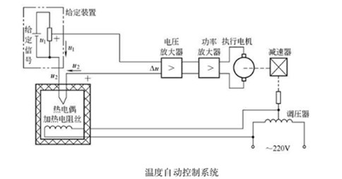 如果將控溫過程中的人工操作 (檢測和調(diào)節(jié)) 換由自動(dòng)控制裝置完成,則成為包裝機(jī)自動(dòng)控溫系統(tǒng)。如下圖所示,檢測元件熱電偶檢測恒溫箱內(nèi)的溫度,并將溫度轉(zhuǎn)換為對(duì)應(yīng)的電壓信號(hào)2 ,同時(shí)反饋給比較器。比較器比較表示給定溫度的給定電壓信號(hào)1與檢測電壓信號(hào)2的大小,得到溫差信號(hào),其大小和正負(fù)代表溫差的大小和方向。溫差信號(hào)△經(jīng)電壓放大和功率放大后,控制執(zhí)行電機(jī)的轉(zhuǎn)速和方向,執(zhí)行電機(jī)通過傳動(dòng)裝置拖動(dòng)調(diào)壓器觸頭調(diào)節(jié)供熱電壓。當(dāng)溫度偏高時(shí),動(dòng)觸頭向著減小電壓( 電流)方向轉(zhuǎn)動(dòng); 反之,當(dāng)溫度偏低時(shí),動(dòng)觸頭則向著增大電壓( 電流)方向運(yùn)動(dòng),直至恒溫箱內(nèi)溫度達(dá)到給定溫度,溫差信號(hào)△=0 時(shí)觸頭停止運(yùn)動(dòng)。