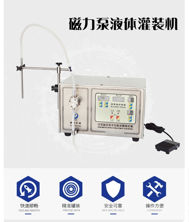 該機(jī)為磁力泵式灌裝機(jī),適用于藥劑、化學(xué)品、油類、化妝品、食品、實(shí)驗(yàn)室用等無顆粒狀液體的灌裝。
